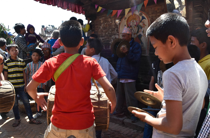 Già alle 9 del mattino migliaia di persone si accalcano nella piazza detta del “vasellame” per via delle ceramiche che vi sono prodotte. Al centro della piazza giace un tronco d’albero altissimo che gli abitanti devono issare prima del tramonto per assicurare fortuna e prosperità alla città. Solamente gli uomini sembrano avere diritto a partecipare: i più anziani sono a capo delle funi legate al tronco mentre i giovanissimi si dispongono all’estremità. Occorrono molti tentativi per raggiungere il traguardo, ogni colpo di reni è ritmato dalle percussioni che suonano alcuni bambini tutt’attorno. La loro bravura mi impressiona al punto che mi concentro esclusivamente sulla loro musica, la cui ripetizione, come una vecchia litania, mi stordisce sotto il sole cocente. Simultaneamente un gigantesco carro in legno intarsiato viene trainato da un punto all’altro della città, i ragazzi si arrampicano sui differenti piani impilati e gli astanti intonano canti tradizionali. Tuttavia io resto concentrato sui giovani musicisti che aumentano la cadenza dei loro colpi senza sosta, almeno fino a quando Morgane non mi ricorda che dobbiamo rientrare a Kathmandu per recuperare il nostro bagaglio all’ostello e prendere l’aereo per Parigi.