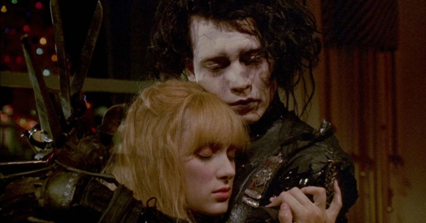 Per un caso, Edward viene trovato da una donna che lo porta con sé nella sua casetta color pastello, che fa parte di una cittadina dai colori vivaci ed aggressivi, popolata da uomini insignificanti e da grasse e smaliziate pin-up decisamente troppo in là con l’età. Lui, la novità, il ragazzo mezzo robotico che non parla quasi mai, diventa un tuttofare (giardiniere, parrucchiere, scultore), incuriosendo sempre più il vicinato. E pensare che Edward guarda solo una di queste donne, la splendida, giovane ed irraggiungibile Kim (Winona Ryder). Può limitarsi solo a guardarla, non può rischiare di toccarla, lui, che non ha le mani, che ha delle orribili forbici con cui potrebbe farle del male per errore. Ed è a causa di un – tragico – errore che Edward, da fenomeno da baraccone curioso ed innocuo, si trasforma, agli occhi degli stupidi ed ottusi abitanti di quella patetica cittadina, in mostro feroce, creatura abominevole, scherzo della natura, da braccare, da inseguire e scacciare con fiaccole e forconi.